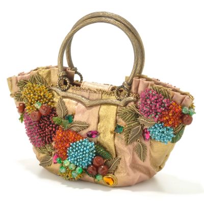 Handcrafted with a decidedly feminine feel, the bag is dressed with bunches of multi-color beaded berries covering the front; the golden bag is finished with a ladylike bracelet handle; magnetic snap closure; brass finish hardware; you'll receive one sleeper bag to protect your handbag when you're not using it.