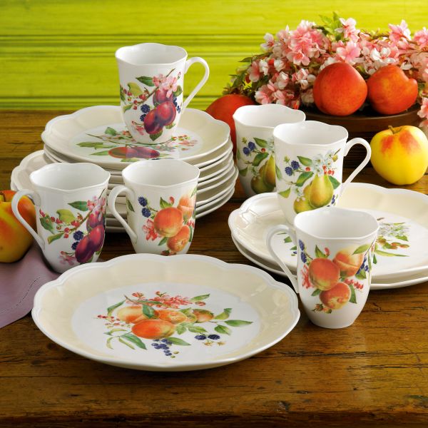 This 18-piece dinnerware set gives you plenty of variety; the set includes two pieces of each Orchard in Bloom pattern - peach, plum and pear - in each shape; that equals 6 dinner plate, 6 accent plates, and 6 mugs; crafted of Lenox fine porcelain microwave- and dishwasher-safe Includes 6 dinner plates, 6 accent plates, and 6 mugs.