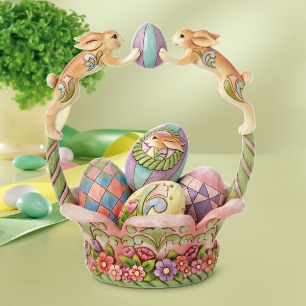 Jim Shore Spirit of Easter Basket: Showcase five Easter eggs inside charming bunny basket. You can remove them to create your own display. Sculpted bunnies holding colorful Easter egg form basket's whimsical handle. All five eggs and beautiful basket, are hand painted and crafted of resin. Height of this basket is 7 ¼ inches.