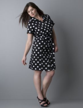 Button front polka dot shirt dress: This stylish shirt dress is must-have for spring, and woven button front style is perfect for office or weekend. It features large white polka dots on black background and self tie belt to create great shape. It also has V-neck style and short sleeves.